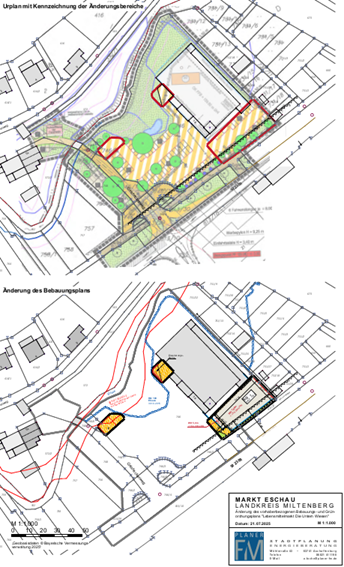 Diese Bekanntmachung ist zusätzlich im Internet auf dem zentralen Landesportal für die Bauleitplanung Bayern www.bauleitplanung.bayern.de und auf der Homepage des Marktes Eschau www.eschau.de in der Rubrik „Wirtschaft, Planen und Bauen“ – Bauleitplanung – laufende Verfahren – Änderung vorhabenbezogener Bebauungs- und Grünordnungsplan „Lebensmittelmarkt Die Unteren Wiesen“ eingestellt (§ 4a Abs. 4 Satz1 BauGB); zusätzlich ist die Planung (Bebauungsplan mit Begründung vom 20.10.2025 einschließlich der im Inhalts- bzw. Anlagenverzeichnis aufgeführten Anlagen) veröffentlicht.